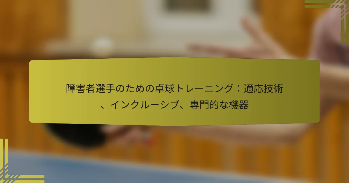 障害者向けの卓球トレーニングは、さまざまな障害に対応するためにゲームプレイやトレーニング方法を修正する適応技術の使用を含みます。特別な機器やコミュニティの関与を通じて包括性を促進することで、組織はすべての選手が効果的に参加し、スポーツを楽しむことができる環境を作り出すことができます。